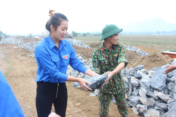 Đoàn viên thanh niên xã Trần Phú hỗ trợ các anh bộ đội chuyển đá xây tường rào bảo vệ sân bay Miếu Môn