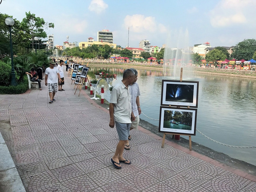 Du khách chụp ảnh với những bức tranh vẽ tại tuyến phố đi bộ