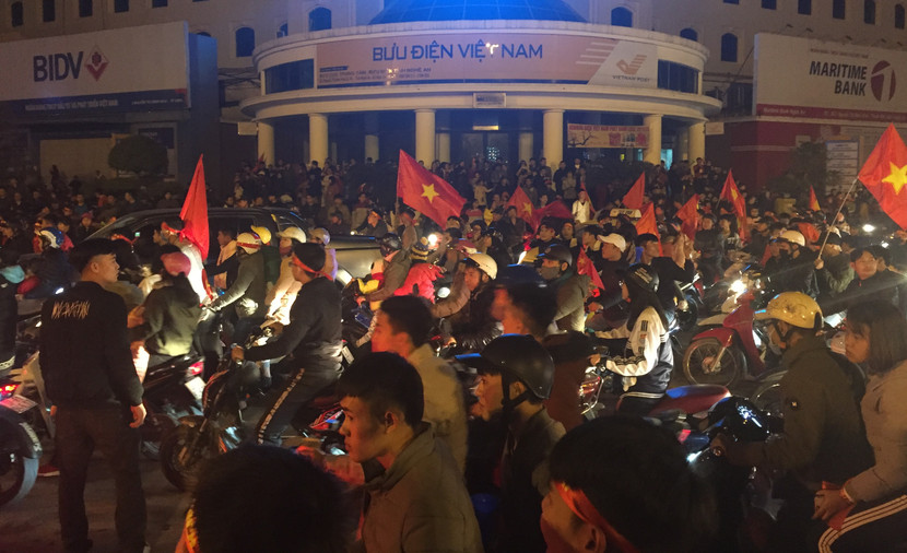 Dòng người đổ ra đường ăn mừng chiến thắng ở TP Vinh
