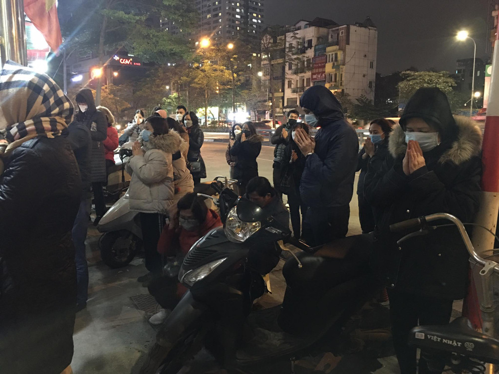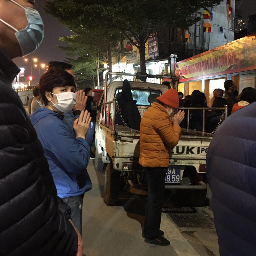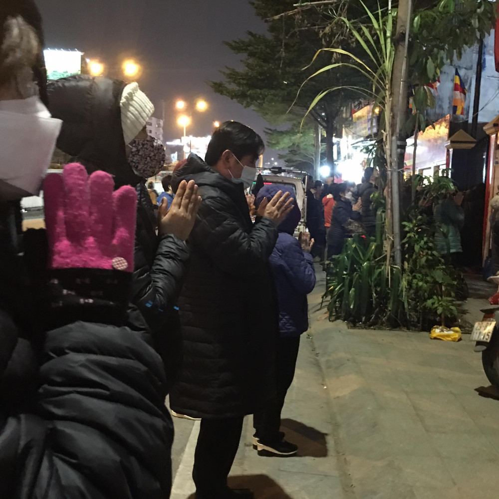 Người dân vái vọng ngoài cổng dự lễ cầu an trực tuyến ở chùa Phúc Khánh