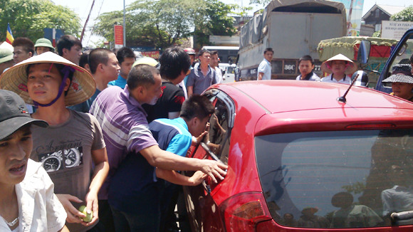 Đúng lúc đó có đoàn tàu hỏa sắp đến nên barie hạ xuống chắn đường, khiến chiếc ô tô phải dừng lại. Bị đám đông vây kín xung quanh, những người trên xe hạ kín kính xe, cố thủ bên trong. Do bức xúc, một số người dân đã dùng hai xe máy khóa đầu và đuôi ôtô, rồi xịt lốp xe, bắt bằng được ba người (hai nữ, một nam) xuống xe để bàn giao cơ quan công an.