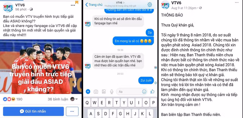 Một chi tiết đáng chú ý là vào tối 9-8, fanpage của kênh VTV6 (thuộc VTV) đăng thông tin hàm ý đã sở hữu bản quyền truyền hình ASIAD, cũng như xác nhận việc sở hữu này trong tin nhắn trả lời độc giả.