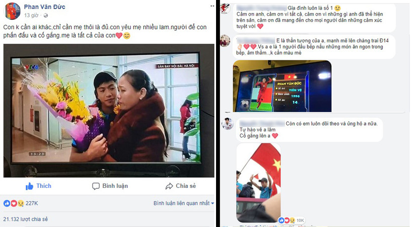 Tài khoản có tên Ng.T.Tr viết: "Không cầm được nước mắt trước khoảnh khắc Phan Văn Đức lặng lẽ ôm mẹ ở góc phòng, không một ai ngó ngàng tới. Bóng đá là môn thể thao tập thể, vị trí nào cũng quan trọng, và phải có tập thể mới tạo ra được những cá nhân xuất sắc".