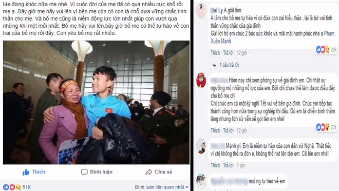 Còn tài khoản M.Ly động viên Xuân Mạnh: "Anh giỏi lắm! Anh làm cho bố mẹ tự hào vì có đứa con giai hiếu thảo, lại là bờ vai tinh thần vững chắc của gia đình. Gửi lời hộ em chúc hai bác sức khỏe và mãi mãi hạnh phúc nhé anh".