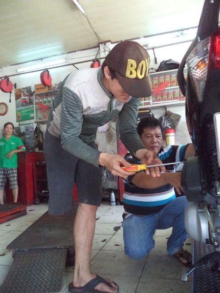“Ngày đó, đi học sửa xe máy, tôi phải tranh thủ đạp xích lô kiếm thêm tiền học phí hay tiền chi tiêu những khoản khác, vì học sửa chữa xe máy phải mất học phí. Nhưng dù vất vả, tôi cũng rất vui. Sau đó thì tôi gom góp tiền mua được cái máy bơm với bộ đồ nghề vá xe, bơm hơi bên lề đường. Bẵng đi một thời gian, công việc làm ăn khấm khá hơn, tôi tích góp tiền mua được cái cửa tiệm này để sửa chữa xe máy và thực hiện ý định mở lớp dạy sửa chữa xe máy tôi đang nung nấu”.