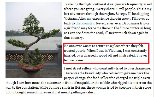Độc giả có tên trungdang cho rằng: “Anh nên đưa thêm một số thông tin có giá trị hơn về chuyến đi của mình, bị kéo áo ở cửa hàng nào tại Hội An, người dân ở thành phố/thị trấn nào đối xử tệ với anh, công ty du lịch nào ở Hạ Long ép khách đặt phòng đơn phải ở thêm người? Biết đâu khi đọc nhận xét của anh, họ sẽ tìm ra sai phạm và nâng cao dịch vụ. Hơn nữa mọi việc còn có thể thay đổi theo từng giây, huống hồ chuyến đi của anh xảy ra từ hơn 4 năm trước”.