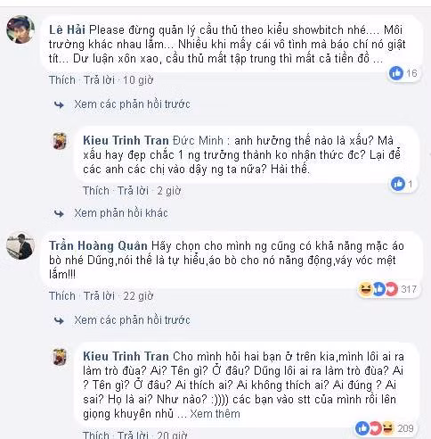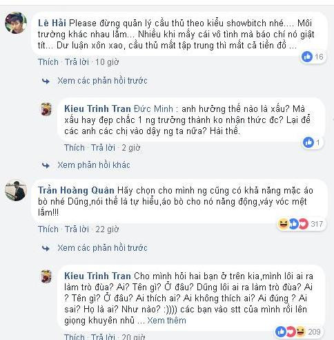 Trước đó, khi một Facebooker để lại lời bình luận đề nghị người quản lý này để yên cho các cầu thủ tập luyện thay vì lên Facebook đăng tải ảnh rồi “tag” các cầu thủ vào hòng hút “like” và gây chú ý. Ngay lập tức, Kiều Trinh đáp trả: “Không thích thôi đấy, sao không?”.