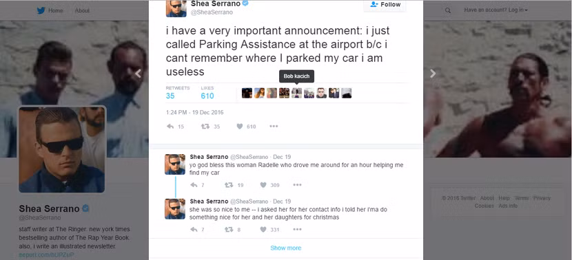 Tác giả cuốn sách “The Rap Yearbook” – Shea Serrano gần đây đã chia sẻ trên mạng xã hội Twitter một trải nghiệm đáng nhớ với Radelle, một nhân viên tại khu để xe ở sân bay. Theo đó, Radelle đã chở anh xung quanh khu để xe suốt một tiếng đồng hồ chỉ để tìm vị trí đỗ xe. Sau khi đỗ xe xong, Serrano phát hiện ra rằng anh ấy không có tiền mặt để tip cho Radelle. Thay vào đó, anh đã xin email của cô ấy để bày tỏ sự cảm kích sau đó.