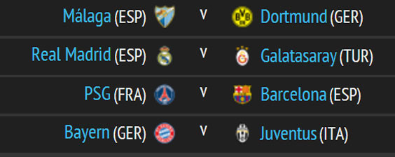 Ứng cử viên hàng đầu cho chức vô địch Real Madrid sẽ gặp Galatasaray. Trong khi đó, Barcelona sẽ có trận đấu khó khăn với "gã nhà giàu nước Pháp" Paris Saint-Germain. Malaga sẽ gặp đội bóng chưa thua trận đấu nào tại Champions League năm nay là Borussia Dortmund. Đại diện duy nhất của Italia là Juventus sẽ đối đầu với Bayern Munich.