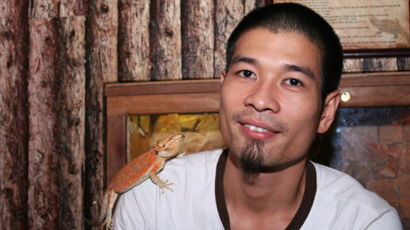 Chủ quán cà phê này là anh Nguyễn Minh Nghĩa, 29 tuổi, đã có thâm niên nuôi các loài động vật bò sát được 5 năm. Ngay từ nhỏ, Nguyễn Minh Nghĩa đã rất thích tìm hiểu về những loài vật sống xung quanh. Năm 24 tuổi, anh Nghĩa bắt đầu nuôi kỳ nhông, bò cạp… Thậm chí đã từng có thời gian, chàng trai này còn đi lùng bắt cả những con nhện rất to… ở các nhà vệ sinh để về nuôi.