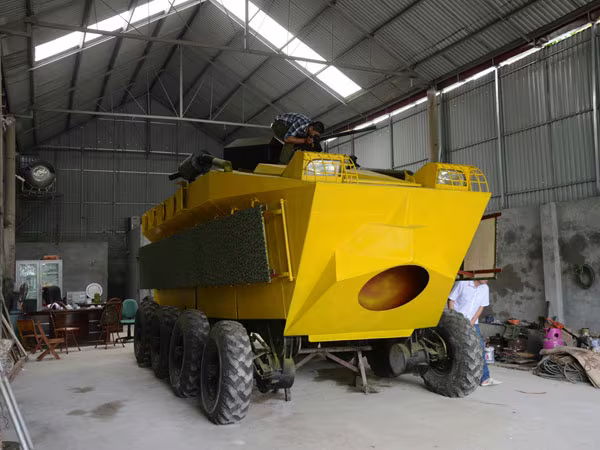 Phần đầu xe được thiết kế có đĩa cắt phá các chướng ngại vật, cắt cây cối hoặc dây thép gai. Bên trong xe là máy chính hoạt động, phía trên có 2 vị trí người ngồi dành cho chỉ huy và người lái xe, trong đó lái xe sử dụng camera và màn hình 13 inch quan sát 4 góc mà không cần mở nắp vẫn điều khiển được. Xe có sức chứa 10-12 người.