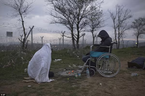 Người tị nạn ngồi ngủ ngoài trời trên ngôi làng biên giới của Hy Lạp