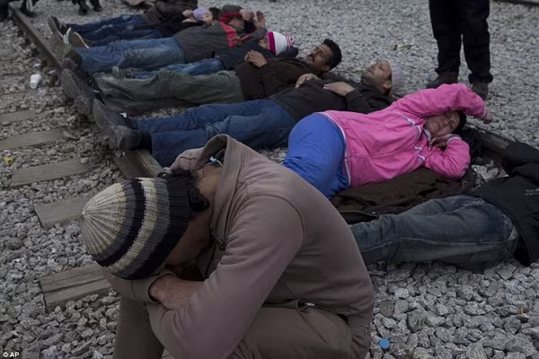 Cuối tuần qua, hàng trăm người tị nạn cũng phản đối chính phủ Macedonia bằng cách ngồi và nằm ngủ trên đường ray xe lửa