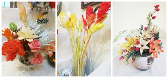 Bước vào cơ sở hoa Việt Nhật, dễ choáng ngợp bởi không chỉ hoa, mà vô số những tác phẩm nghệ thuật được biến tấu từ đủ loại hạt, hoa, cỏ, thậm chí là… rau. Ông chỉ cho chúng tôi xem một lẵng hoa gồm những bông rất to, đẹp. Khi ông nói rằng nó được làm bằng… bắp cải thì ai cũng ngỡ ngàng vì từ một loại rau giản dị lại có thể làm thành bông hoa có tính thẩm mỹ cao như vậy. Ông hồ hởi “khoe”, chỉ từ một loại hoa phi yến cũng có thể “hóa kiếp” thành 3 sản phẩm khác nhau, và mỗi thứ lại mang một phong cách riêng.