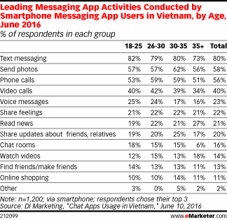 Về tính năng, không có gì đáng ngạc nhiên khi tin nhắn văn bản được dùng nhiều nhất ở Việt Nam, ở tất cả người dùng smartphone ở mọi nhóm tuổi. Tuy nhiên, có sự khác biệt về mục đích sử dụng ở theo độ tuổi.