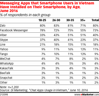 Theo nghiên cứu, ứng dụng nhắn tin nội địa Zalo đã vượt mặt Facebook Messenger ở tất cả nhóm tuổi và gần gấp đôi ứng dụng ở vị trí thứ 3 của bảng xếp hạng là Viber. Phần lớn người tham gia khảo sát đều cài Zalo và Facebook trong điện thoại.