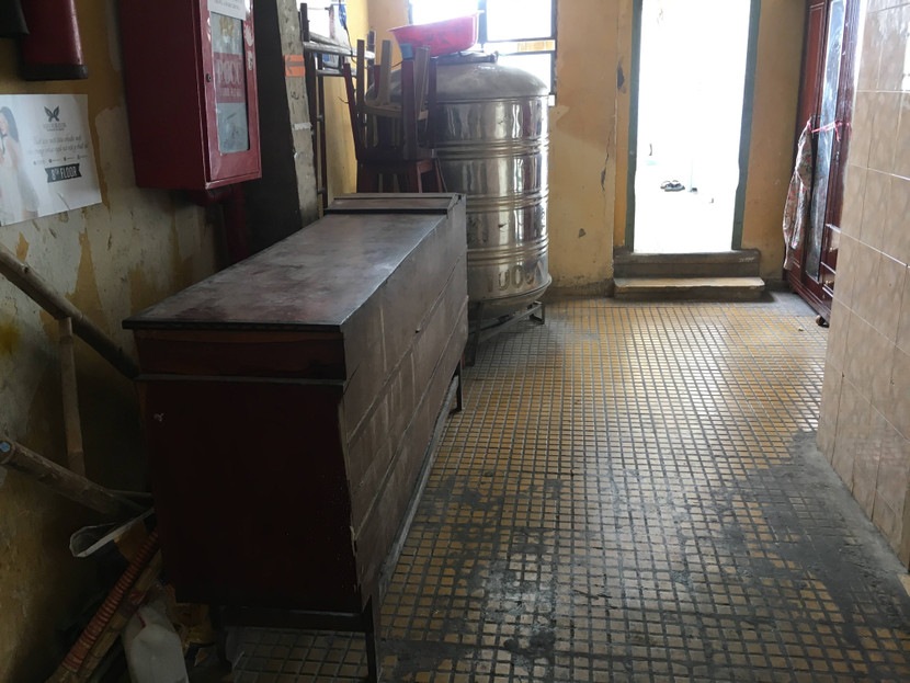 Đáng nói, dọc hành lang chung cư này bình chữa cháy được để ngổn ngang dưới đất, tủ, bàn người dân để dọc, cản lối đi. Nhiều hộ dân còn tận dụng lối thoát hiểm để để hàng hóa. Ông Hải đã yêu cầu dọn các điểm bán hàng tại hành lang để trả lại sự thông thoáng cho chung cư.