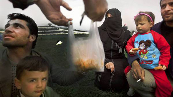 Người dân Syria nhận thực phẩm cứu trợ tại khu vực biên giới với Thổ Nhĩ Kỳ