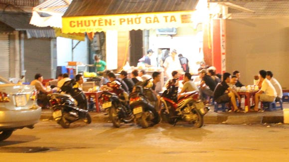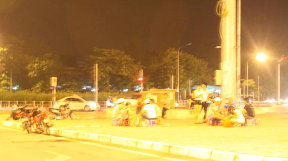 23h30 ngày 26-7, chúng tôi qua một số tuyến phố mà hàng quán thường xuyên có biểu hiện vi phạm về mở cửa quá giờ quy định như dãy quán ốc phố Phạm Ngọc Thạch - Lương Định Của; Đê La Thành - Giảng Võ; cạnh cửa hầm chui Đại Cồ Việt; rượu mực ở ngã tư phố Hàng Bồ - Hàng Đào; Quảng trường Đông Kinh Nghĩa Thục... chỗ nào cũng náo nhiệt khách ăn uống. Khi thấy bóng dáng của lực lượng công an, cả chủ lẫn khách nháo nhác thu dọn bàn ghế, thế nhưng tình cảnh đâu lại vào đấy khi lực lượng chức năng đi khỏi.