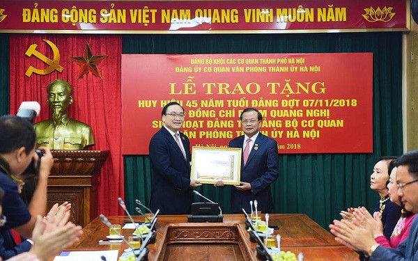 Đầu giờ sáng nay, Đảng bộ khối các cơ quan thành phố Hà Nội đã tổ chức lễ trao tặng Huy hiệu 45 năm tuổi Đảng đợt 7-11-2018 cho đồng chí Phạm Quang Nghị, nguyên Ủy viên Bộ Chính trị, nguyên Bí thư Thành ủy Hà Nội.