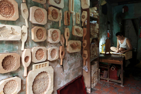 Nghệ nhân Phạm Văn Quang (59 Hàng Quạt) làm khuôn bánh Trung thu (Ảnh của Lê Bích)