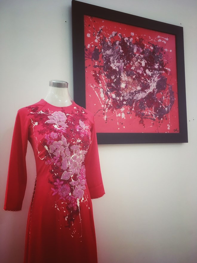 Một trong 10 thiết kế áo dài được Cao Minh Tiến thiết kế lấy cảm hứng từ chính bức tranh do anh vẽ
