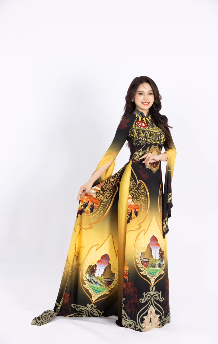 | Một mẫu áo dài trong bộ sưu tập "Bản sắc di sản Việt" được thí sinh "Mrs Earth Vietnam 2024" trình diễn trong đêm chung kết. |
