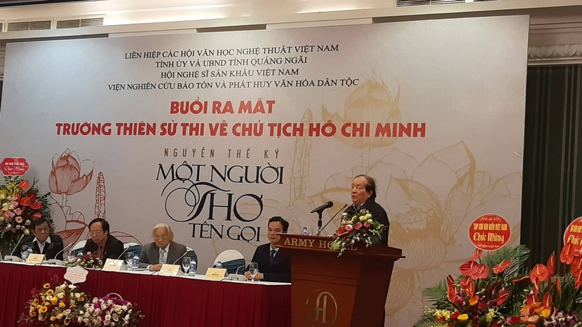 Nhà thơ Hữu Thinh, Chủ tịch Liên hiệp các hội VHNT Việt Nam phát biểu tại lễ ra mắt tập thơ