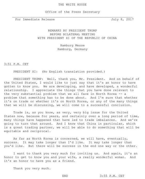 Tuy nhiên, trong thông cáo báo chí của Nhà trắng về nội dung trao đổi giữa ông Donald Trump và ông Tập Cận Bình trước khi diễn ra hội đàm song phương lại nhầm lẫn gọi ông Tập Cận Bình là chủ tịch của Đài Loan (President of The Republic of China), chứ không phải là Chủ tịch của Cộng hòa Nhân dân Trung Hoa.