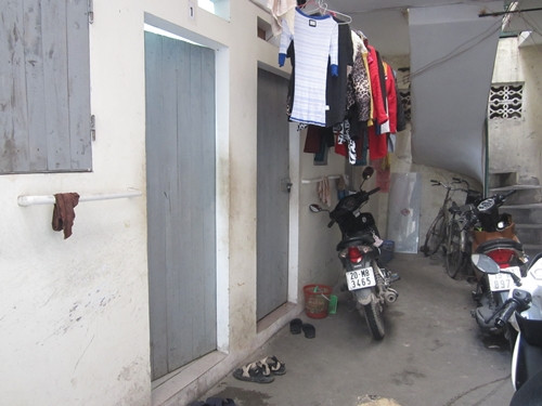 Xóm trọ của bà Loan ở Đại Mỗ - Từ Liêm nằm ngay cạnh con kênh thoát nước thải đen ngòm, ngày nắng bốc mùi rất khó chịu. Cả dãy 16 phòng trọ chỉ có 2 nhà vệ sinh chung và 2 nhà tắm. Gọi là nhà tắm nhưng thực chất là gian bếp cũ rách được che chắn bởi phông bạt… để dùng tạm. Sinh viên ở đây hầu hết là ĐH Công nghiệp HN cho biết, nếu vào mùa hè thì có khi các phòng phải xếp hàng tắm đến 12h đêm mới hết lượt.
