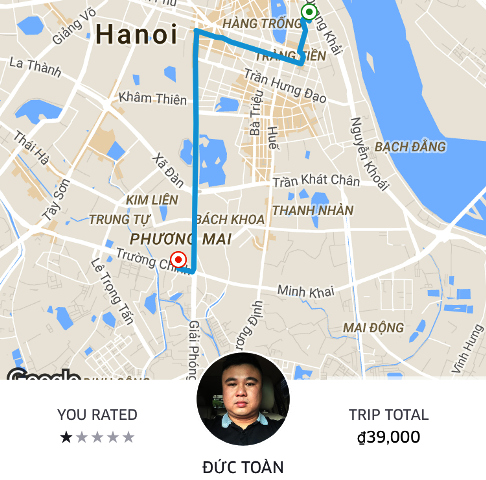 Chị Nguyễn Thu Trang cho hay, địa chỉ khách đón xe là 8A Ngô Quyền, Hà Nội cho hành trình về 155 Trường Chinh, Hà Nội. Hành trình của chị được lái xe Uber tên Đức Toàn, xe Kia Morning nhận đón.