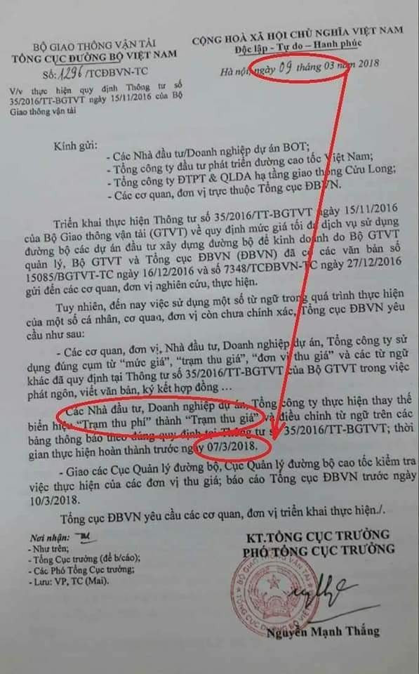 Cụ thể, ngày 2/3/2018, Vụ Tài chính – Tổng cục Đường bộ Việt Nam đã tham mưu trình lãnh đạo Tổng cục Đường bộ Việt Nam ký công văn hỏa tốc (văn bản số 1296), trong đó yêu cầu các nhà đầu tư, doanh nghiệp dự án, các tổng công ty hoàn thành việc thay thế biển hiệu từ “trạm thu phí” thành “trạm thu giá” trước ngày 7/3/2018 và các Cục quản lý đường bộ kiểm tra, báo cáo về Tổng cục Đường bộ Việt Nam trước ngày 10/3/2018.
