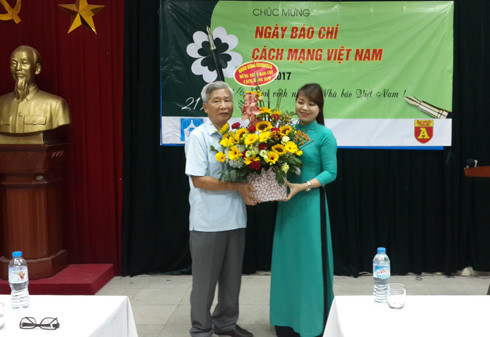 Ông Nguyễn Viêm Hoàng, Phó Chủ tịch Thường trực Hội Nhà báo thành phố Hà Nội đón nhận lãng hoa từ Giám đốc nhãn hàng Evashoes, bà Cao Thị Thanh Nga
