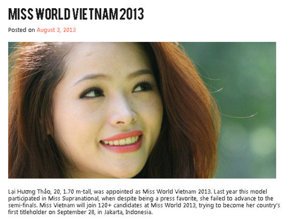 Việc chọn Lại Hương Thảo được bà Thúy Nga – Giám đốc công ty Elite khẳng định là sự lựa chọn phù hợp nhất vào thời điểm hiện nay. Người đẹp gốc Quảng Ninh được đánh giá có vẻ đẹp mặn mà, gương mặt rất ăn ảnh và thể hình chuẩn. Hương Thảo cũng có kinh nghiệm cọ xát quốc tế với việc vừa giành giải “Hoa hậu châu Á – Thái Bình Dương” tại sân chơi “Hoa hậu Siêu quốc gia 2012” diễn ra tại Ba Lan.