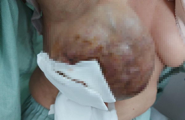 Vì sợ đến bệnh viện nên bà T. tự điều trị theo sự mách bảo của mọi người bẳng đủ biện pháp như: uống mật động vật, cao hổ cốt, xạ đen… nhưng không hiệu quả. Khoảng 5 năm nay, ngực bà trở nên bầm tím, lở loét, thỉnh thoảng rỉ máu, bốc mùi khó chịu. Mới đây, khi khối u vú lở loét, chảy máu ồ ạt, bà mới chịu đến viện.