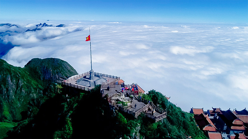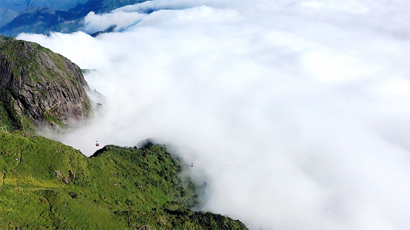 Mây kết lại như một tấm nệm êm ái, mềm mại như bông khiến ta như muốn thả mình tận hưởng cảm giác bồng bềnh siêu thực đó. Trên những triền núi dốc, mây lại cuộn trào như thác đổ. Từng đợt sóng nhẹ nhàng chảy trôi ôm lấy những mỏm núi sắc cạnh rồi bỗng chống tan biến vào hư không. Ngắm cảnh sắc ấy, bất cứ ai cũng phải thốt lên, Fansipan mùa này tựa chốn “bồng lai tiên cảnh”.