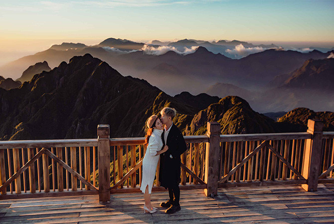 Hãy rủ nàng dậy thật sớm, bắt ngay chuyến cáp đầu tiên để kịp cùng nhau đón khoảnh khắc bình minh kỳ ảo trên Nóc nhà Đông Dương. Hoặc chờ đến chiều muộn để trao nhau nụ hôn giữa ánh hoàng hôn rực lửa, hai bạn sẽ có được những tấm ảnh để đời.