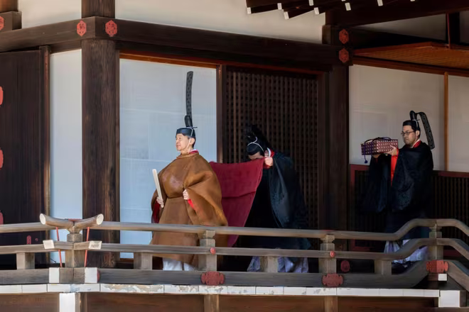 Nhân viên Cục Hoàng gia tháp tùng Nhật hoàng, mang theo thanh kiếm và bảo ngọc Hoàng gia, 2 trong số 3 báu vật linh thiêng tượng trưng cho ngôi Nhật hoàng.