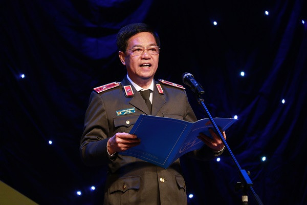 Thiếu tướng Đoàn Duy Khương - Giám đốc CATP Hà Nội phát biểu tại đêm công diễn và trao giải Liên hoan sân khấu kịch nói Công an Thủ đô 2017