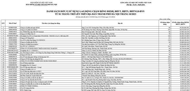 Bảo hiểm xã hội thành phố Hà Nội vừa công bố danh sách đơn vị sử dụng lao động chậm đóng bảo hiểm xã hội, bảo hiểm y tế, bảo hiểm xã hội từ 1 tháng trở lên trên địa bàn thành phố Hà Nội.