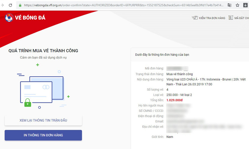 Chị Thu Trang chia sẻ hình ảnh xác nhận mua vé thành công trận Việt Nam - Thái Lan