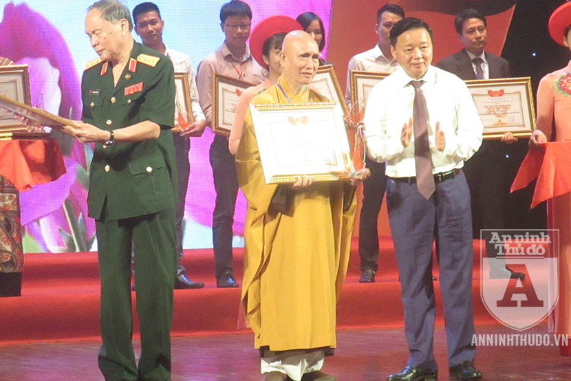 Bộ trưởng Bộ Tài nguyên và Môi trường Trần Hồng Hà (ngoài cùng, bên phải) và Thượng tướng Nguyễn Văn Rinh - Chủ tịch Hội Nạn nhân chất độc da cam/dioxin Việt Nam (ngoài cùng, bên trái) - trao bằng khen tặng các cá nhân, đại diện doanh nghiệp đã đồng hành