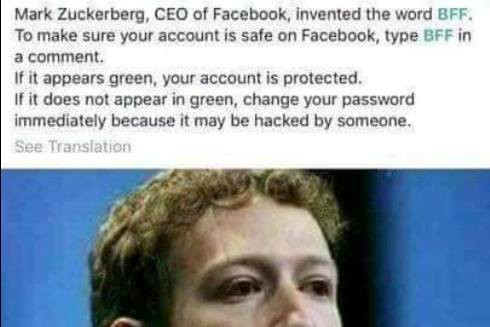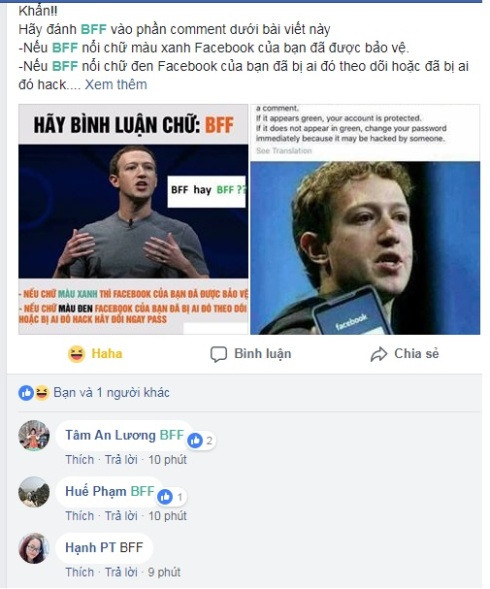 “Hãy bình luận chữ BFF: Nếu chữ màu xanh thì Facebook của bạn đã được bảo vệ. Nếu chữ màu đen thì Facebook của bạn đã bị ai đó theo dõi hoặc bị ai đó hack, hãy đổi ngay pass” là nội dung thông tin “cảnh báo” đang được không ít người dùng mạng xã hội Facebook chia sẻ hiện nay.