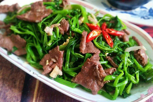 Hồi bé, khi dạy nấu ăn cho tôi, bà ngoại tôi cứ dạy đi dạy lại cách phân biệt thịt bò với thịt trâu. Bà bảo, ăn thịt trâu độc, nhà có gái đẻ, hay người ốm mà ăn nhầm phải thịt trâu là nhiều khi còn ốm thêm. Lớn lên, đi làm thấy mốt ăn thịt trâu rầm rộ, lại còn đắt hơn cả thịt bò. Hệ thống quán “trâu giật” phố lớn nào mà chẳng có. Trâu xào rau muống thấy có vẻ thông dụng và nhiều người ăn hơn cả. Hóa ra, rau muống còn xào với cả thịt trâu cơ đấy.
