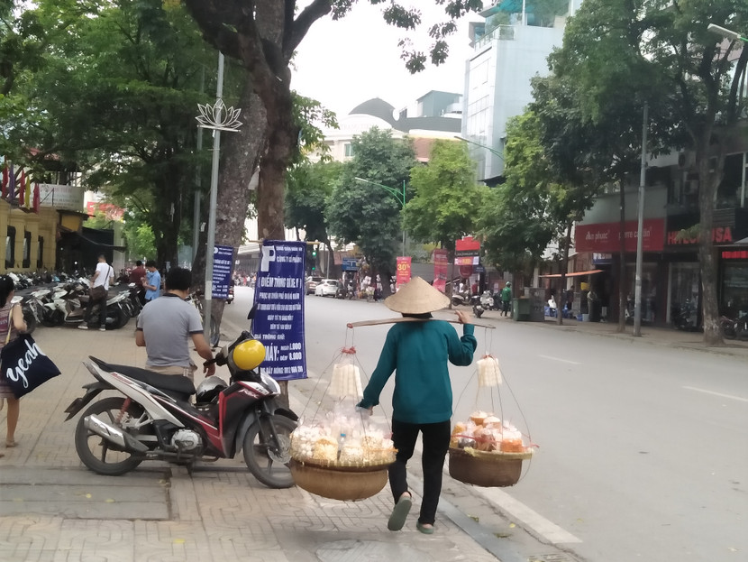 Ngại ngùng giấu vội củ khoai lang sau vành nón, từ chối cho tôi biết tên và địa chỉ, nhưng người phụ nữ bán bánh dạo vẫn đồng ý lán lại chia sẻ với tôi đôi câu về công việc của chị. “Ngày nào cũng rã rời chân tay, mệt lắm chứ, vất vả lắm chứ, nhưng cũng tự biết thân biết phận, mình ở quê lên phố chả có gì ngoài gánh hàng rong kiếm “ba cọc ba đồng”, víu lấy được cái nghề này mà mưu sinh là tốt lắm rồi”.
