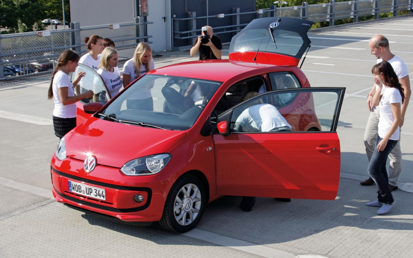 Một nhóm tình nguyện viên từ đội truyền thông của VW đã được giao nhiệm vụ “nhồi nhau” vào chiếc Up!, mẫu xe gần đây đã được công bố chuẩn bị đưa vào sản xuất và có một vài bản concept được trưng bày tại triển lãm Motor Frankfurt hồi tháng 9 vừa qua. Với 2 người ngồi ở khoang chứa đồ, 7 người ở ghế sau, 4 ở ghế trước, 2 người ở chỗ để chân, và một ngồi trên bảng đồng hồ, Up! đã “ép” được 16 tình nguyện viên nén chặt trong cabin và vẫn còn có thể đóng được cửa, cửa phụ và cả cửa sổ. Volkswagen thậm chí còn mở cửa chào đón những người “ưa thích chật chội” để thử thách lần thứ 2 khi Up! chính thức ra mắt tại châu Âu vào ngày 2-12 tới.
