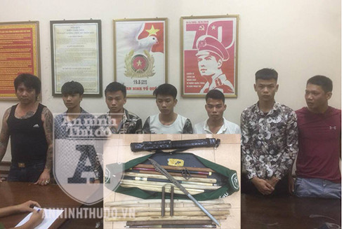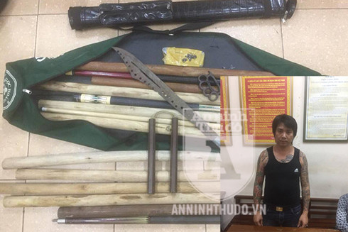Thời điểm kiểm tra, trên ô tô có 7 nam thanh niên xăm trổ đầy mình. Trong cốp xe có một túi màu xanh dài khoảng 1,2m, bên trong là 14 cây gậy gỗ, 1 côn nhị khúc, 1 nắm đấm kim loại, 1 tuýp sắp dài, đầu có gắn dao nhọn…