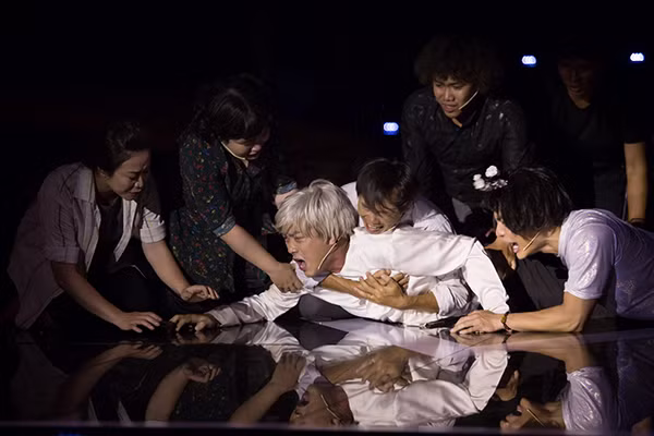 Phân cảnh ông Sáu nhảy khỏi xe lăn gào khóc nhớ thương người chị đã mất vì bão giông không có cầu phải qua đò khiến người xem xúc động của nhóm Kỳ tài