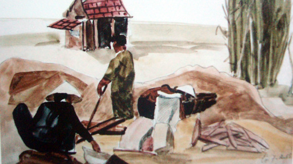 Họa sĩ kể, một buổi chiều vừa dựng dàn giáo xong, chuẩn bị vật liệu định trèo lên để vẽ thì máy bay Mỹ bất ngờ ập đến. Chỉ mới kịp hút xong điếu thuốc lào ai ngờ một ánh sáng vụt qua, tiếng réo của làn bom rú rít, rồi tiếng nổ dữ dội ầm vang, cái dàn giáo đổ sập. Hút chết, nhưng họa sĩ lại cùng anh em tiếp tục dựng dàn giáo khác, vẽ cả đêm xong mới nghỉ. Bức tranh cổ động tươi mới sắc màu, dưới bãi cỏ cháy đen vì bom đạn làm họa sĩ dạt dào cảm xúc, với những dòng thơ, cùng những hình tượng chiến sĩ và các bà mẹ anh hùng trên trận địa.