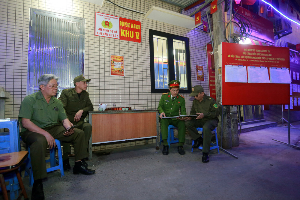 ANTD.VN - Khi ánh đèn đường bắt đầu thắp sáng cũng là lúc lực lượng Cảnh sát khu vực - CAP Khương Đình cùng các thành viên trong Lực lượng tham gia bảo vệ an ninh, trật tự ở cơ sở Khu dân cư số 5, phường Khương Đình (Hà Nội) bắt đầu ca trực xuyên đêm. Tại khu vực bầu cử số 11, công tác tuần tra đảm bảo an ninh, trật tự, kiểm soát nhân hộ khẩu đang được rà soát triển khai, đảm bảo từng con ngõ, góc phố đều bình yên trước giờ cử tri đi bỏ phiếu.